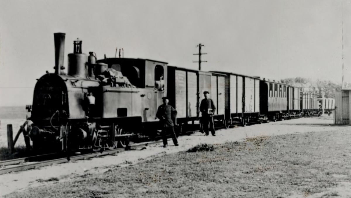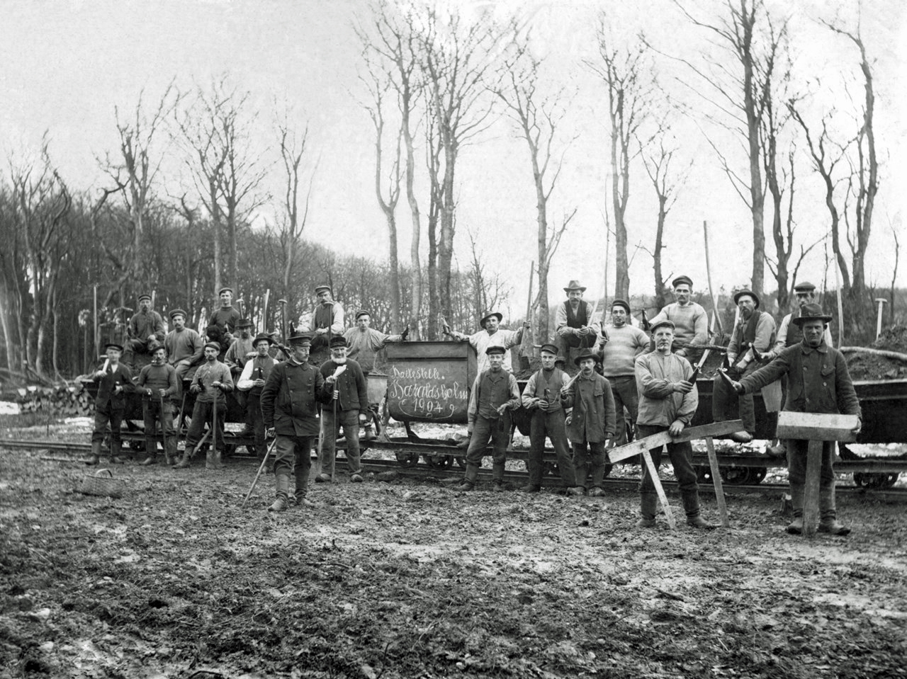 Billedforedraget viser gamle foto af anlægsarbejdet, tog og stationerne.